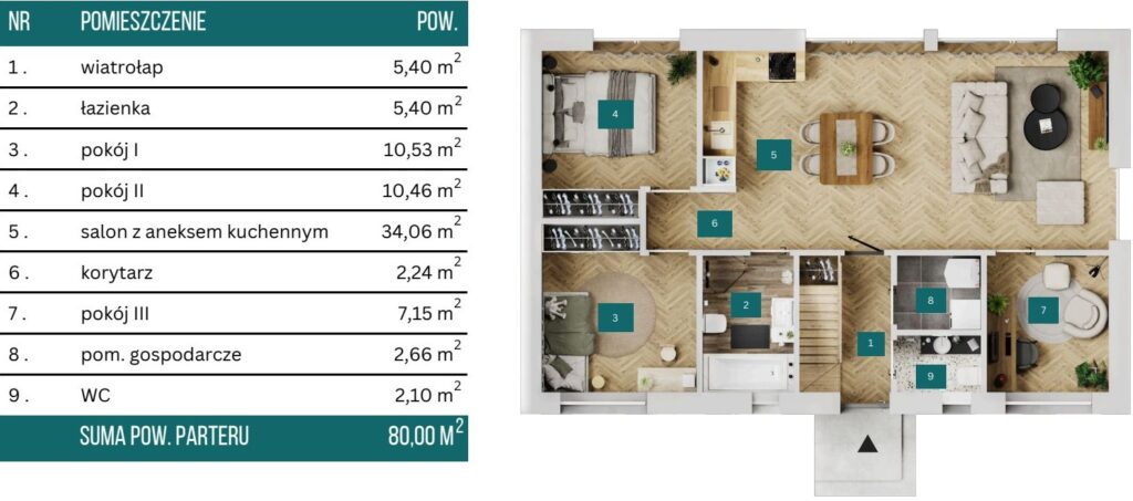 Optymalny dom z salonem oraz trzema sypialniami. Kuchnia, wiatrołap, pomieszczenie gospodarcze, łazienka, osobne wc.
