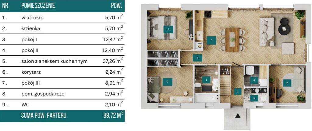 Komfortowy dom z salonem oraz trzema sypialniami. Kuchnia, wiatrołap, pomieszczenie gospdarcze, łazienka, osobne wc